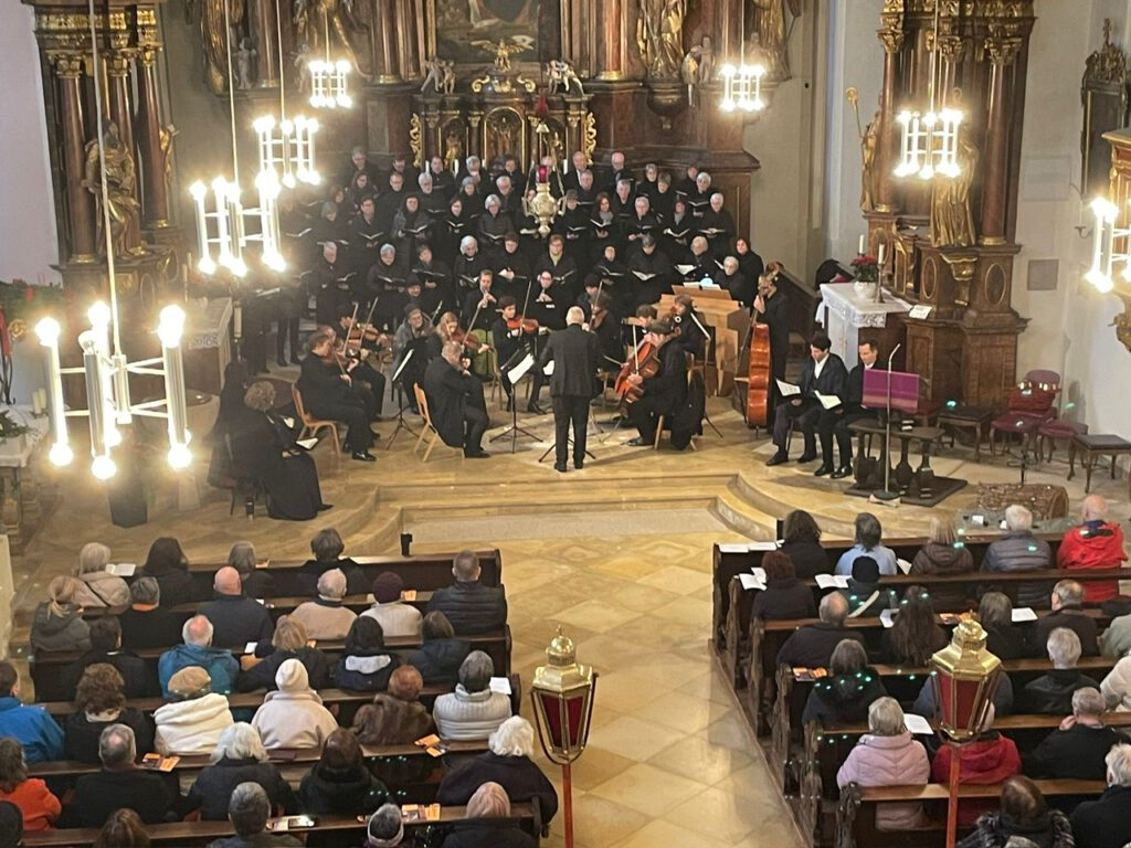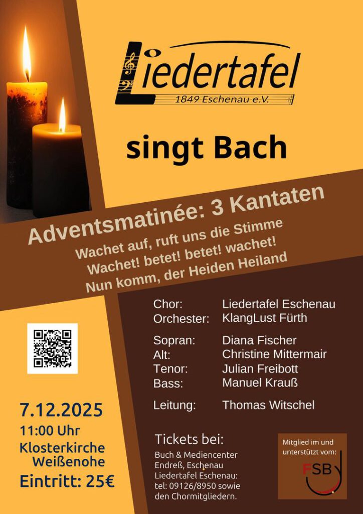 Beworben mit diesem Plakat und aufgeführt zu einem für uns sehr ungewöhnlichen Zeitpunkt: am Vormittag am 2. Adventssonntag. Dennoch, vielleicht auch deswegen haben viele an Bachs Musik Interessierte den Weg ins Konzert gefunden. Im Programmheft gibt es Zusatzinformation über die Solisten, den Chorleiter und den Chor, ebenso wie je eine Werksbeschreibung der Kantaten und natürlich die kompletten Texte der Choräle, Rezitative und Arien.